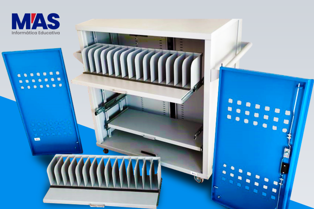 Para traslado y carga de baterias de notebooks, netbooks y tablets. Cuatro puertas, dos con acceso a los dispositivos y las restantes con acceso al sector eléctrico, baterías, toma corriente, térmicas, disyuntor, etc.